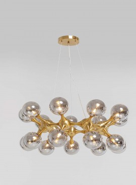 Ekskluzywna lampa wisząca i bardzo modne wzornictwo. Aż 18 kul z dmuchanego szkła z przydymionymi kloszami. Połączenie kolorystyki złota i szarych lśniących szklanych kul to designerskie rozwiązanie obok którego nie można przejść obojętnie. Dla entuzjastów modnych trendów wnętrzarskich.