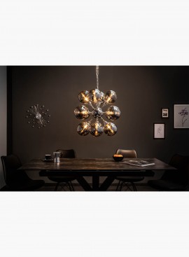 Szykowna lampa stworzona ze szklanych kul i metalu, nowoczesna i przypominająca nieco modernistyczną konstrukcję.
