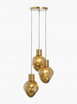 Organicznie ukształtowane, trzy szklane klosze, zawieszone na różnych wysokościach, mienią się złotym - bursztynowym kolorem, a ich nieregularne kształty mają rzeźbiarski efekt.