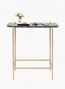 W przypadku tej konsoli mamy do czynienia z oryginalnym asymetrycznym blatem z najwyższej jakości kamienia naturalnego, z surowo wykończonymi krawędziami oraz stalową podstawą w złotym wykończeniu z delikatnym efektem postarzenia. Nieregularny kształt blatu nadaje awangardowego charakteru. Czarny marmur.