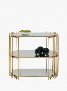 Owalna konsola o bardzo unikalnym, nowoczesnym designie, z trzema lustrzanymi półkami i dekoracyjnie „zamkniętymi” bokami, ze złotych prętów w ładnym odcieniu złota, przód i tył częściowo „otwarte”. Ze względu na swoje kompaktowe wymiary i opływowy kształt ta konsola znajdzie zastosowanie nawet w miejscach, gdzie nie ma dużo wolnej przestrzeni.