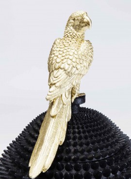 - Ozdobny pojemnik z gwarancją stylu. Ten dekoracyjny przedmiot w rozmiarze XL jest szczególnie piękny: złota papuga będąca gorącym trendem wnętrzarskim w ostatnim czasie, znajduje się na szczycie czarnej kuli z kolcami - tworząc intrygująca mieszankę