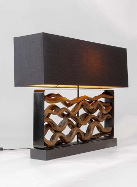 Ta designerska lampa ma charakter artystycznego przedmiotu i równie dobrze zaprezentuje się na konsoli w przedpokoju, jak i na kredensie w jadalni czy komodzie w salonie albo sypialni. Duża, ze stalową ramą, lampa Nature Wave w kolorze czarnym z artystycznie ułożonymi kawałkami drewna w podstawie. Efektowna lampa, która kontrastem sześciennych form i figlarnej naturalności wygląda jak rzeźba. Każdy kawałek drewna w tej lampie jest unikalny i wykonany z recyklingowanego drewna dryfującego (driftwood), woskowanego ręcznie. Idealnie sprawdzi się także we wnętrzach w industrialnym stylu.