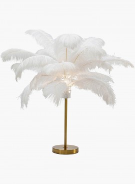 Lampa stołowa w formie palmy z efektownym kloszem ze strusich piór. Dzięki tej nowoczesnej lampie z pierzem, możesz z jednej strony wprowadzić do swojego domu tropikalny klimat i wygląd dżungli, a z drugiej strony styl glam i boho. Emituje „miękkie”, pośrednie światło.