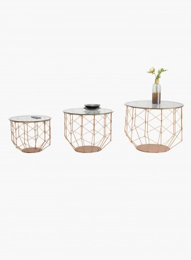 Zestaw trzech stolików Wire (3/Set) w kolorze miedzianym, zestawy stolików to jedno z najmodniejszych rozwiązań w urządzaniu wnętrz. Geometryczna, solidna, jednak prezentująca się delikatnie forma w stylu nowoczesnym, przeplatające się druty w kolorze miedzianym i szklane okrągłe blaty prezentują się oryginalnie i dają możliwość połączenia z wieloma stylami urządzenia wnętrz, doskonałe do stworzenia wnętrza w stylu soft loft.