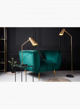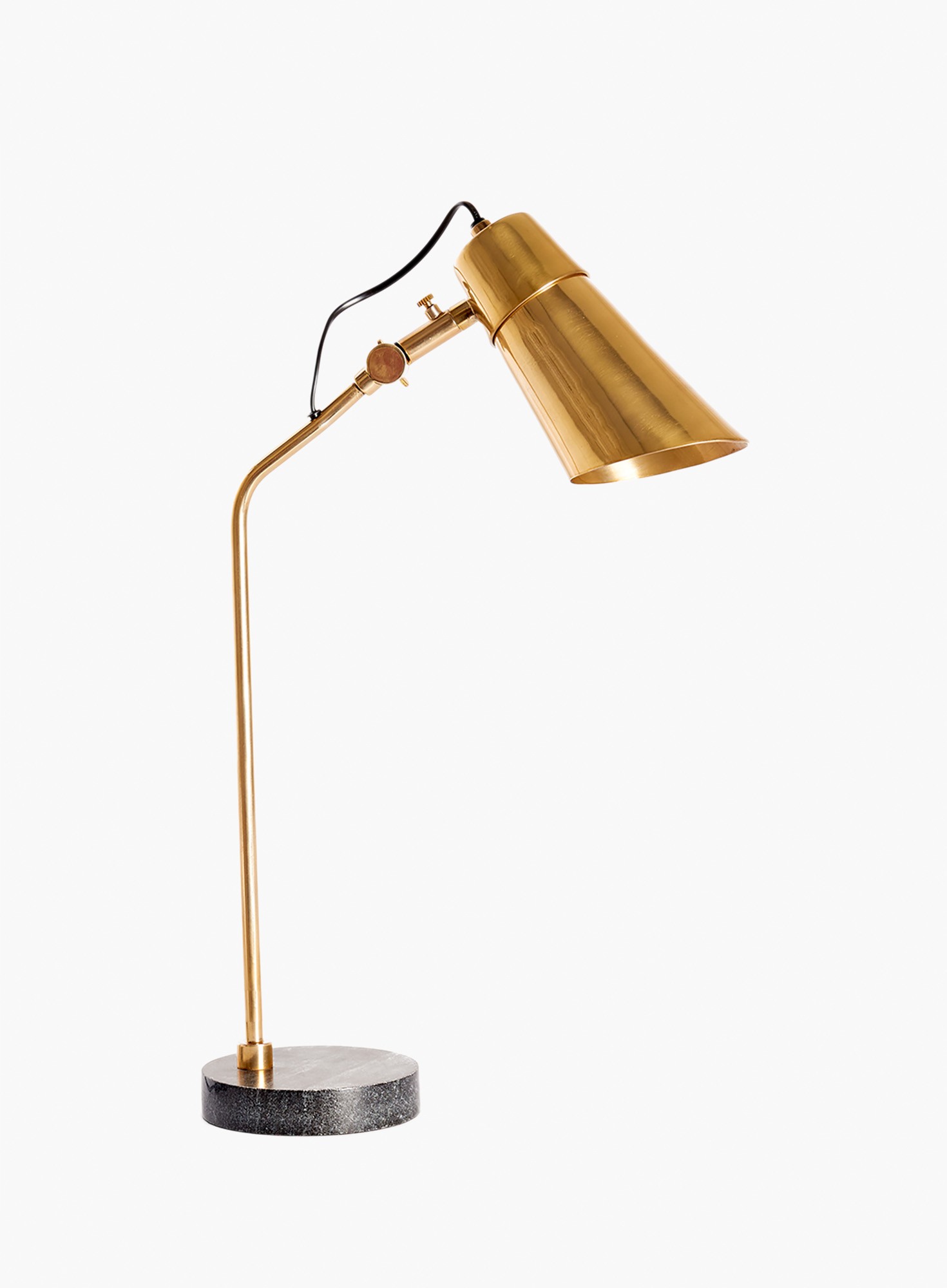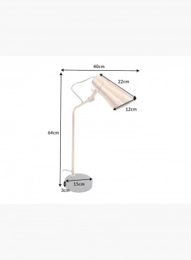 Złota lampa stołowa/biurkowa w eleganckim, nieco industrialno-loftowym stylu, marmurowa okrągła podstawa, dzięki swej niewielkiej średnicy pozwala na postawienie tej lampy nawet w miejscu gdzie przestrzeń jest bardzo ograniczona. Lampa wykonana jest z aluminium. Tworzy nastrojowe punktowe, ukierunkowane światło dzięki budowie klosza-„reflektora”.
