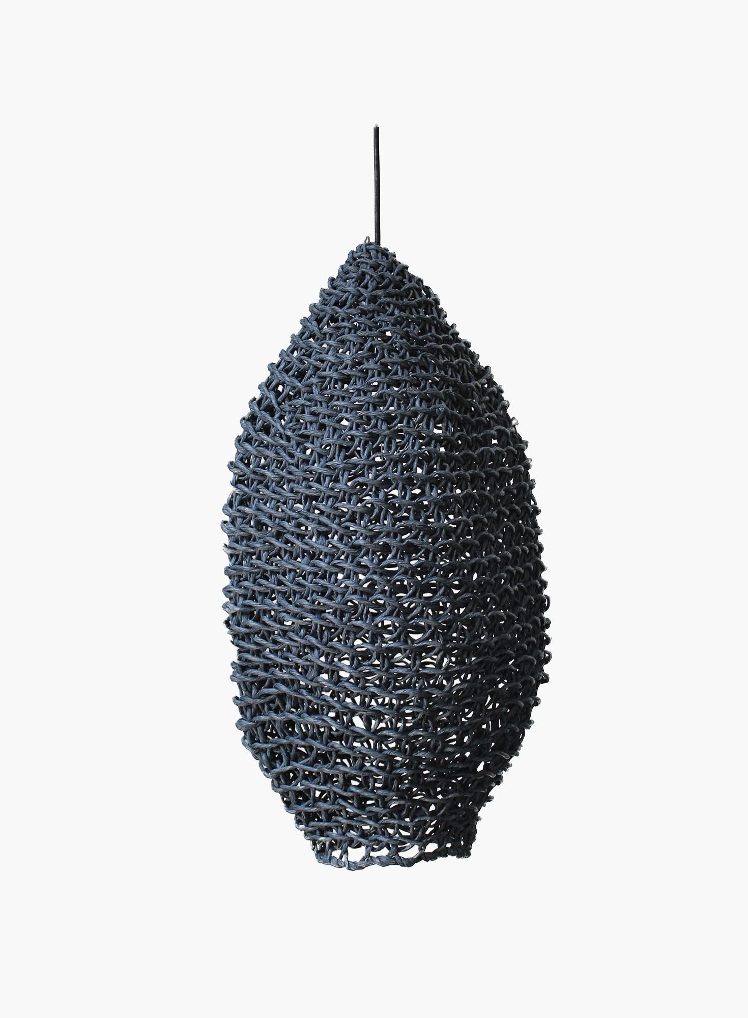 Tutaj duża lampa wisząca, w wersji w kolorze czarnym, smukły podłużny kształt, o gęstym splocie.