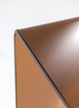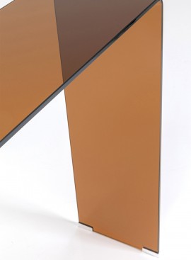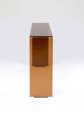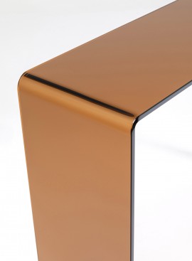 Ta konsola przedstawia najnowsze trendy, w całości wykonana ze szkła w kolorze bursztynu, prostokątna, z zaokrąglonymi brzegami, tworzy jednolitą płynną linię jako jeden element bez osobnego blatu i podstawy. Sprawdzi się doskonale we wnętrzu minimalistycznym jak i jako podstawa do stworzenia aranżacji w nowoczesnym, eleganckim stylu do połączenia na przykład z dodatkami w odcieniach złota.