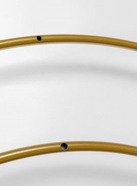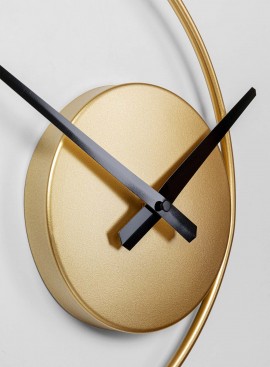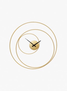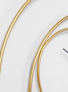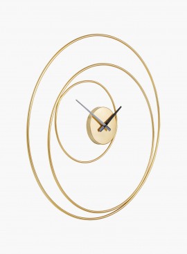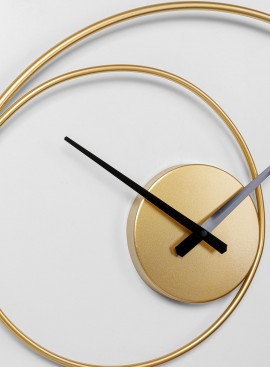 Modne, duże zegary nie tylko odmierzają czas ale i są efektowną dekoracją ścian, w przypadku tego modelu, jego siła tkwi w prostocie, składa się on z trzech złotych, „obręczy” i to one tworzą tu cały przyciągający wzrok efekt. Czarne wskazówki.